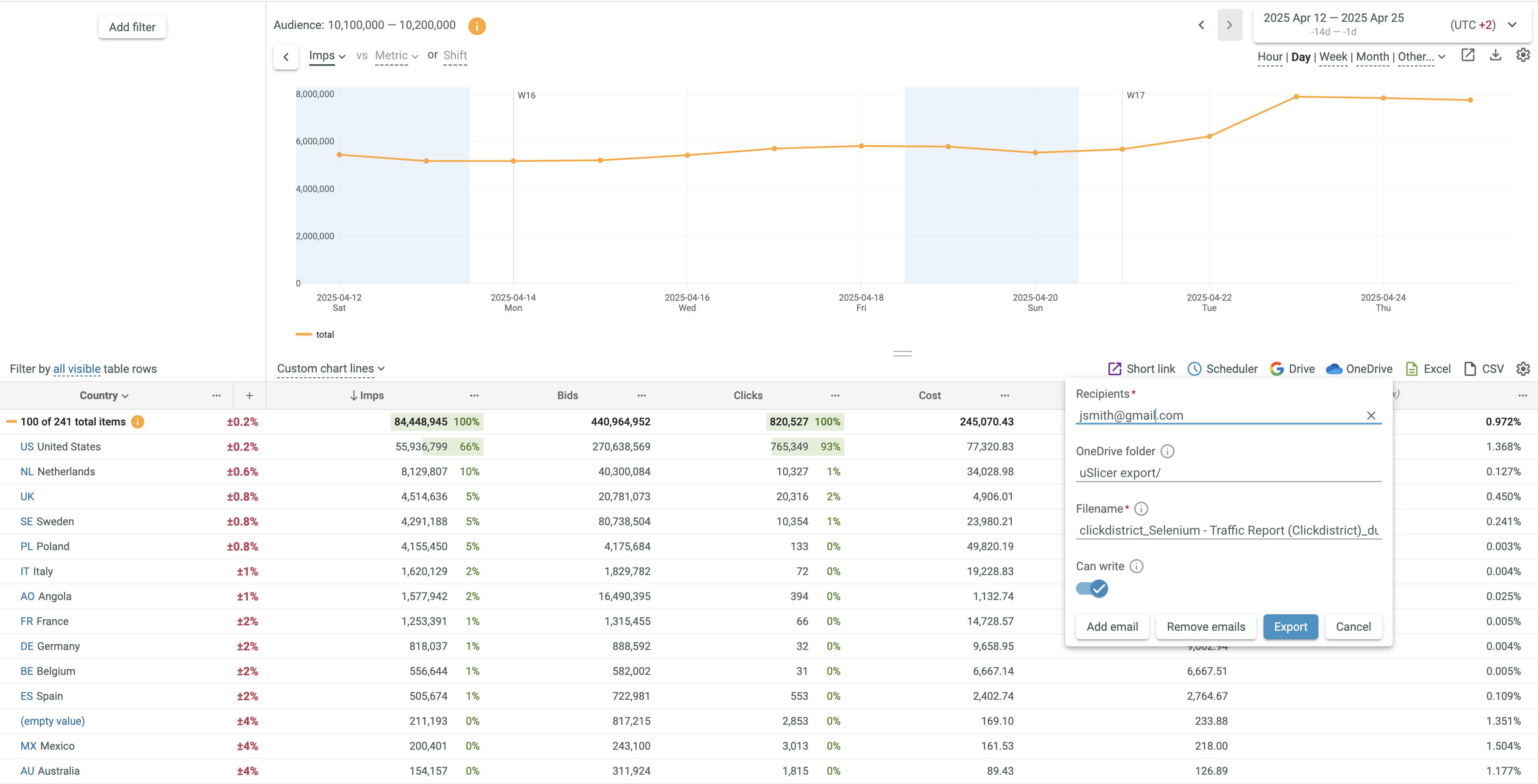 • The Report Data is exported to a new Google Sheets file, the links to this file are sent to the specified emails. Maximum 300000 matching data rows are exported.