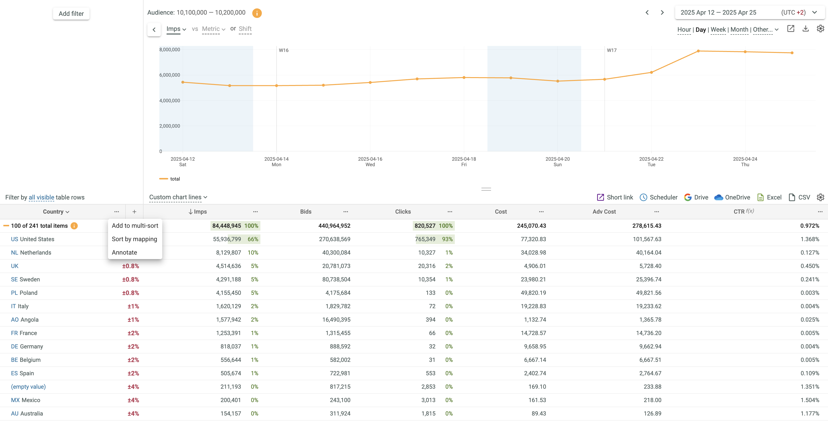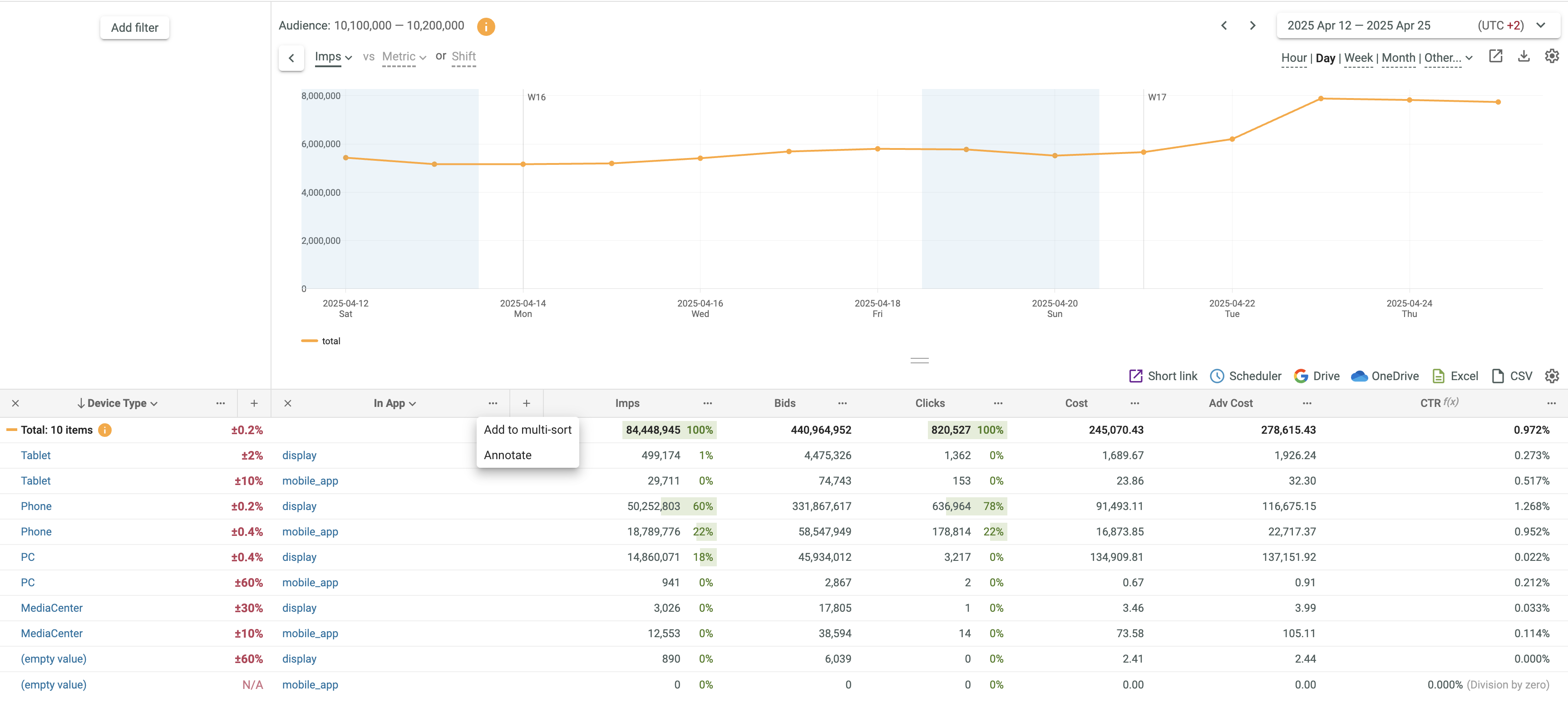 - The 1 and 2 signs in the key field headers show that sorting is performed by two columns (first by Device Type and then by Browser).